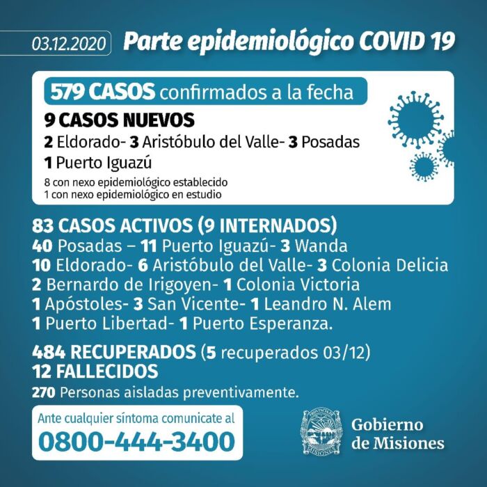 El Ministerio de Salud de Misiones informó este jueves por la tarde que se registraron 9 casos nuevos de Covid-19 en la provincia y el total de infectados asciende a 579.