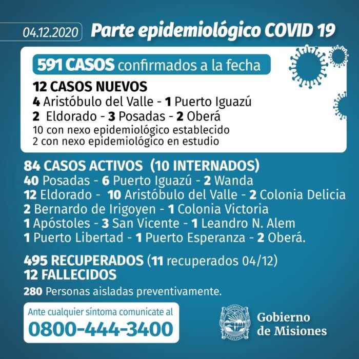 El nuevo parte epidemiológico emitido en la tarde de este viernes por el Ministerio de Salud Pública de Misiones confirmó que se registraron 12 casos positivos de Covid-19 y el total de infectados se eleva a 591.