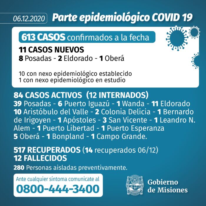 Con los positivos de la jornada de este domingo, la provincia llega a los 613 en lo que va de la pandemia, y Oberá a 5 casos activos.