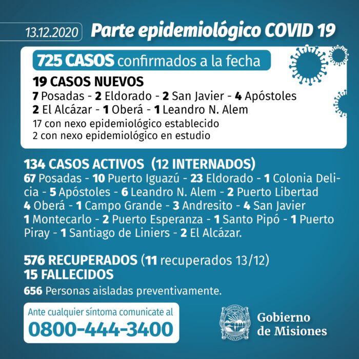 El Ministerio de Salud Pública de Misiones informó este domingo -a través de un comunicado oficial- que se registraron 19 nuevos casos positivos de Covid-19 y la provincia suma un total de 725 confirmados desde el inicio de la pandemia.