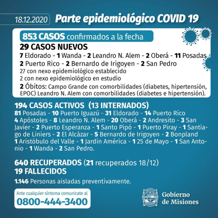 El Ministerio de Salud Pública de Misiones informó este viernes por la tarde -a través de un comunicado oficial- que se registraron 29 nuevos casos positivos de Covid-19 en Misiones y el total de infectados asciende a 853.