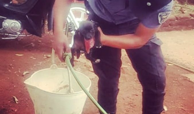 CERRO AZUL. Efectivos de guardia de la Comisaría local intervinieron en el rescate de un animal canino de dos meses que cayó al interior de un profundo pozo ubicado en una vivienda de Av. Libertador de Cerro Azul.