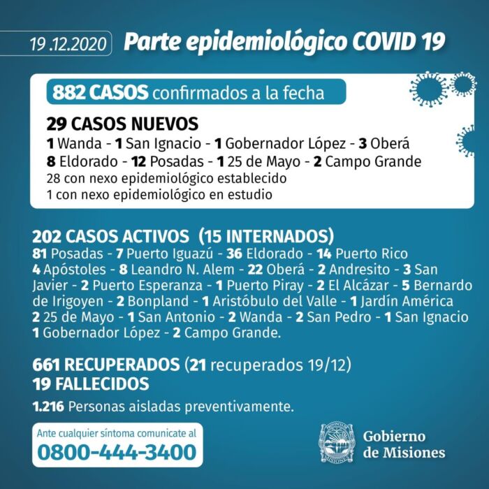 El Ministerio de Salud Pública de Misiones informó este sábado por la tarde -a través de un comunicado oficial- que se registraron 29 nuevos casos positivos de Covid-19 y el total de infectados asciende a 882.