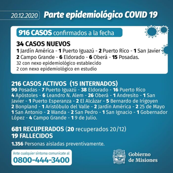 El Ministerio de Salud Pública de Misiones informó este domingo -a través de un comunicado oficial- que se registraron 34 nuevos casos positivos de Covid-19 en Misiones y el total de infectados asciende a 916.