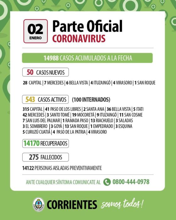 Hay 543 enfermos activos, de los cuales 100 se encuentran internados en el hospital de Campaña, en condición clínica estable. De los activos positivos 315 corresponden a Capital, 41 Paso de los Libres, 2 de Santa Ana, 36 de Bella Vista, 5 Itatí, 42 Mercedes, 3 Santo Tomé, 19 Mocoretá, 9 Ituzaingó, 11 San Cosme, 7 San Luis del Palmar, 1 Ramada Paso, 13 Riachuelo,3 Saladas, 3 El Sombrero, 3 Goya, 13 de San Roque, 1 Empedrado, 3 Esquina, 5 Curuzú Cuatiá, 4 Paso de la Patria y 4 Virasoro.