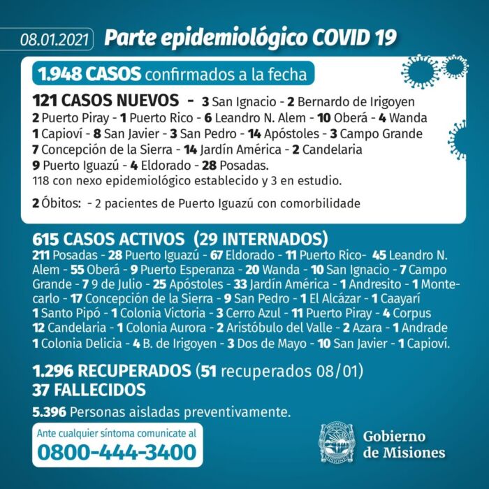 Además, la cartera sanitaria comunicó que se confirmaron 121 casos positivos, con los cuales se eleva a 1948.