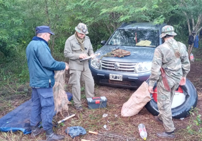 La patrulla llegó hasta la unión del arroyo “El Falso” y el Arroyo “Urugua-I”, donde se observa varios vehículos, en el lugar procedieron a la revisión de los mismos y en uno de ellos se encontraron dos conservadoras con varias piezas de pescados de la especie Sábalo, dos redes de diferentes mallas y medidas, una cámara de vehículo la cual se usaba para colocar las redes en el agua, tres riles, un colchón inflable, y una caja de pesca.
