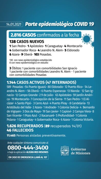 El Ministerio de Salud Pública de Misiones informó este jueves por la tarde -a través de un comunicado oficial- que se registraron tres nuevos muertos por Covid-19 y 138 casos positivos.
