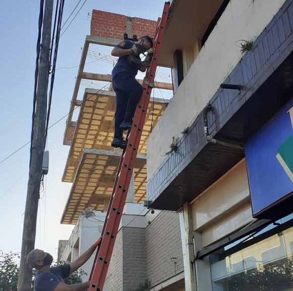 Ayer por la tarde, efectivos de la División Bomberos de la Policía, fueron requeridos en calle Gobernador Barreyro, por el motivo de que un gato se encontraba en el techo de una vivienda sin poder bajar.