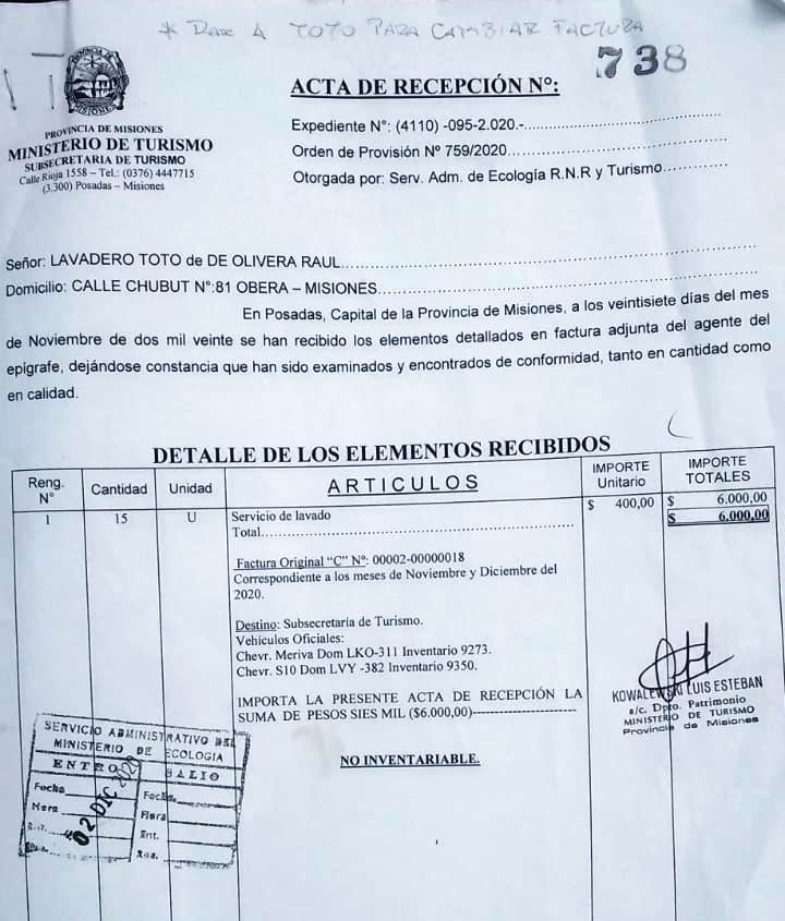 El trabajo costó 1200 pesos por los tres lavados, explicó Raúl “Toto” De Olivera, dueño del lavadero; pero el Coordinador General de la Subsecretaría de Turismo, Joselo Martinez, que se autodefine en los audios como el “Pollo de Tony” pretendió, en principio, que se hagan figurar 15 lavados (1 cada 4 días), supuestamente hechos durante los meses de noviembre y diciembre de 2020, sumando así 6 mil pesos por Compra Directa Nº 656 aprobada por disposición 36 del 20/10/2020 de la Subsecretaría de Turismo de Misiones.