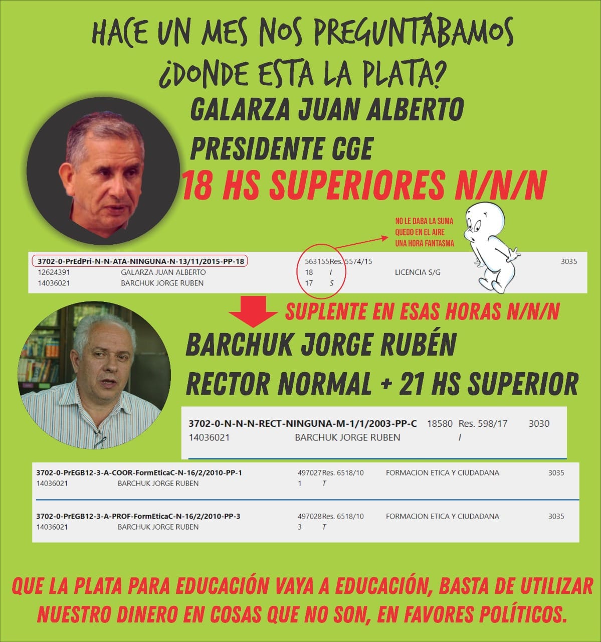 Los Trabajadores de la Educación de Misiones en lucha denunciaron que el presidente del CGE, Alberto Galarza, posee horas superiores sin asignación de curso y espacio curricular. A través de las redes sociales, escracharon al funcionario pidiendo que «la plata para educación vaya a educación, basta de utilizar nuestro dinero en cosas que no son, en favores políticos».