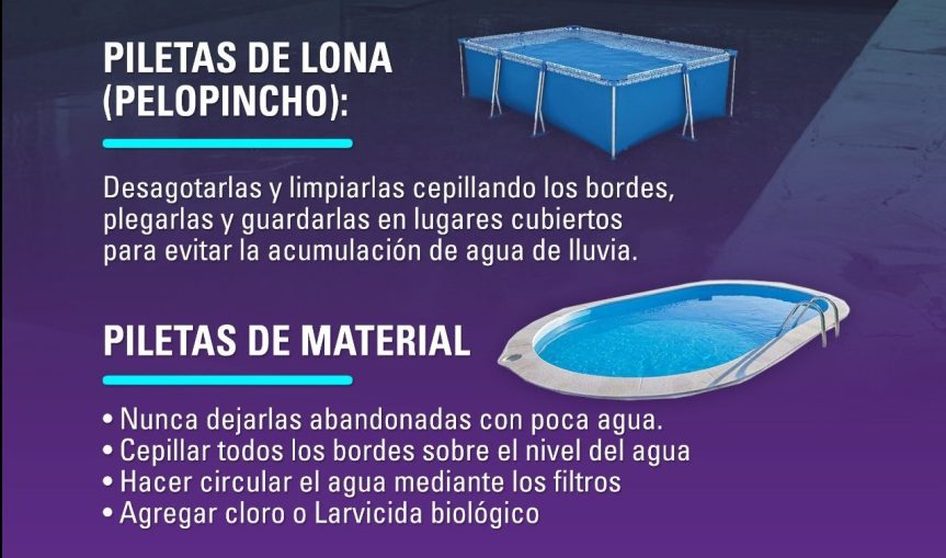 En las piletas grandes la recomendación es que siempre estén llenas y en movimiento. Se tienen que cepillar correctamente todos los bordes ya que el mosquito pega los huevos sobre paredes sólidas y rectas a 1 milímetro por arriba del agua. También es importante agregar cloro y hacer circular el agua mediante los filtros al menos una vez por día, y nunca dejar que tenga poca agua o dejarlas vacías y que junten agua de lluvias.