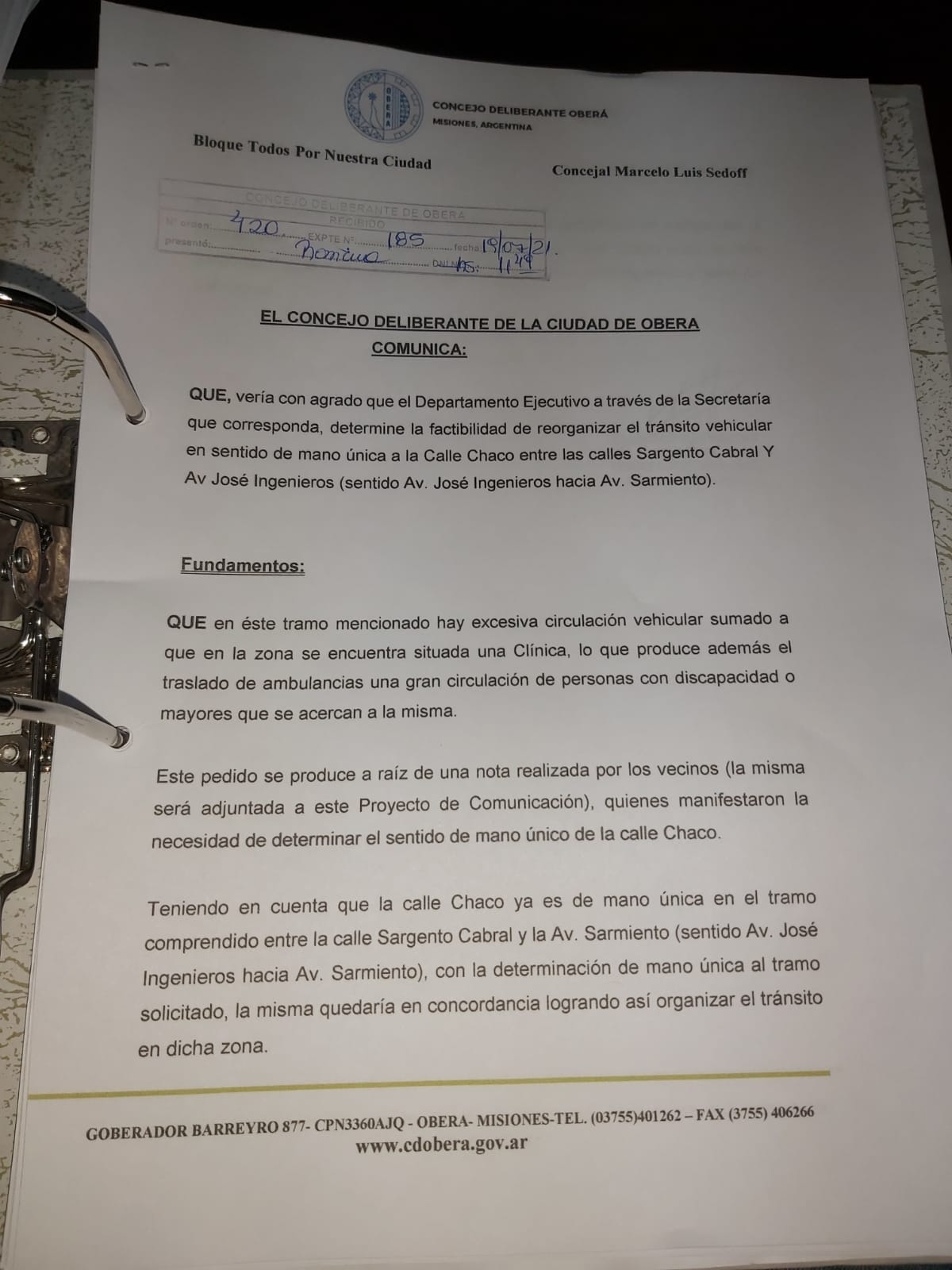 Entre los temas ingresados este martes, el concejal Marcelo Sedoff presentó un proyecto de comunicación solicitando al Ejecutivo Municipal establecer el sentido de circulación en mano única de calle Chaco desde Av. José Ingenieros hasta Sargento Cabral.