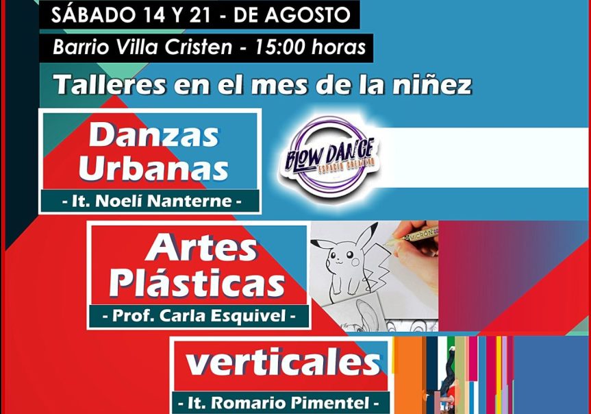Los sábados 14 y 21 de agosto, en el playón deportivo de Villa Cristen, se realizarán talleres artísticos en el marco de actividades por el mes de la niñez. Será a partir de las 15hs.