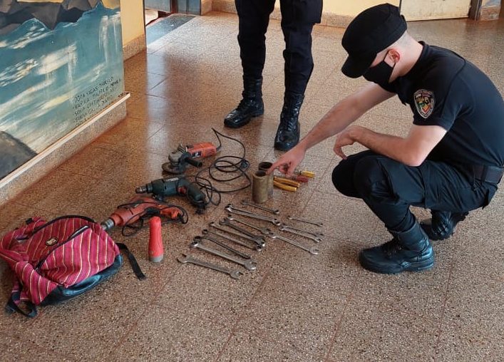 Por el hecho, efectivos de la División Comando Sur detuvieron en la calle 25 de Mayo a un joven de 20 años que intentó darse a la fuga con una mochila cargada de herramientas y demás objetos de dudosa procedencia.