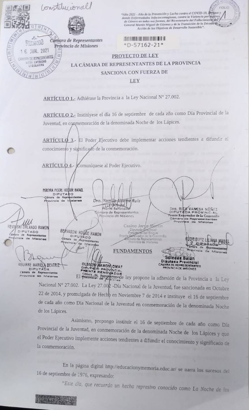 El diputado provincial Rafael Pereyra Pigerl presentó un proyecto para se instituya el día 16 de septiembre de cada año como Día Provincial de la Juventud, en conmemoración de la denominada Noche de los Lápices.
