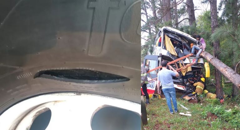 Sin embargo, ayer jueves a las 11.30 de la mañana, el mismo colectivo de la empresa mencionada, viajaba de Puerto Iguazú a Posadas cuando reventó otro neumático, chocó con un vehículo y despistó terminando contra los pinos.