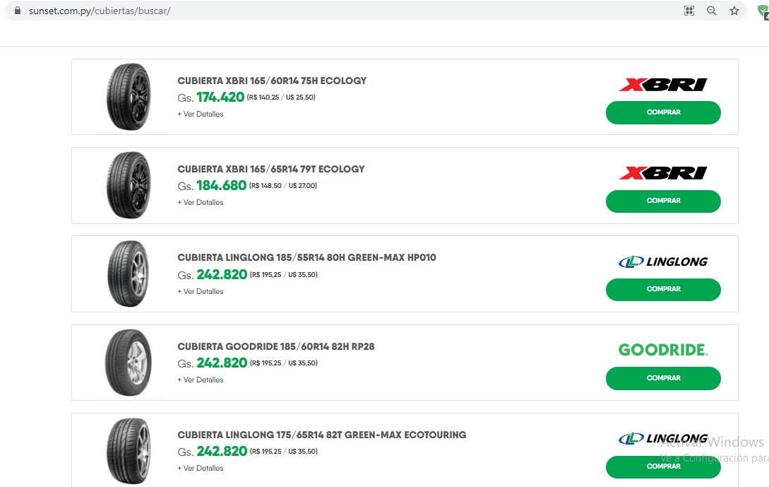 En ese sentido, la empresa paraguaya Sunset Cubiertas ofrece productos en rodado 14 desde Gs. 174.420 XBRI 165/60R14 75H ECOLOGY , lo que al cambio argentino actual equivalen a 2.501 pesos. La marca CUBIERTA GOODRIDE 185/60R14 82H RP28 tiene un costo de Gs. 242.820, es decir $3.483, mientras que en rodado 15 185/65R15 88H RP28 marca Goodride ofrece desde 277 mil guaraníes, unos 3973 pesos. Esta empresa ofrece ventas por internet para se retirados en alguno de sus tres locales ubicados en ese país.