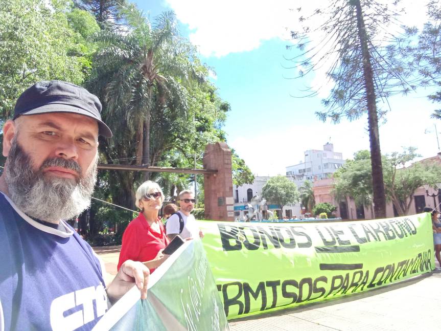 Un grupo de ambientalistas integrado por diferentes organizaciones, entre ellos la CTA, se manifestaron este viernes en Posadas frente a la Casa de Gobierno contra los bonos de carbono. Además se reunieron con el gobernador Oscár Herrera Ahuad para entregarle una nota de rechazo.
