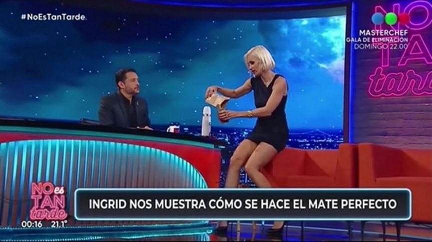 Así, en medio de la entrevista que Grudke llevaba adelante con el conductor del programa nocturno de Telefe, de repente éste le pidió que le enseñase a preparar el mejor de los mates. Teniendo en cuenta que Misiones -sus pagos- es la tierra de la yerba mate por excelencia, Ingrid aceptó gustosa el desafío, y hasta llevó su propio mate de madera con su nombre para dar la masterclass.