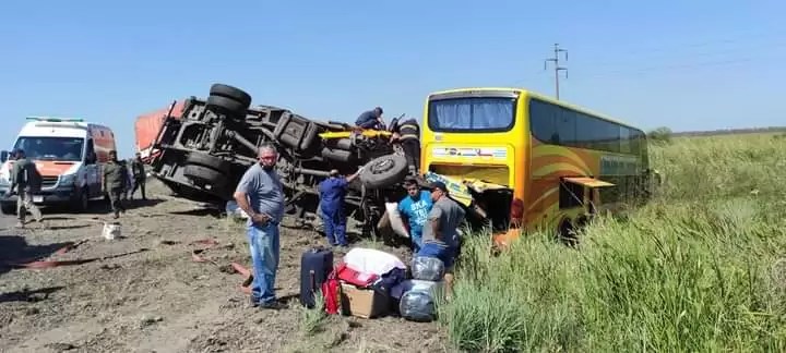 Un camión de carga pesada con un acoplado que venía en el mismo sentido impacto contra el ómnibus de manera violenta, provocando que tanto el colectivo como el camión terminaran por fuera de la banquina al costado de la ruta.