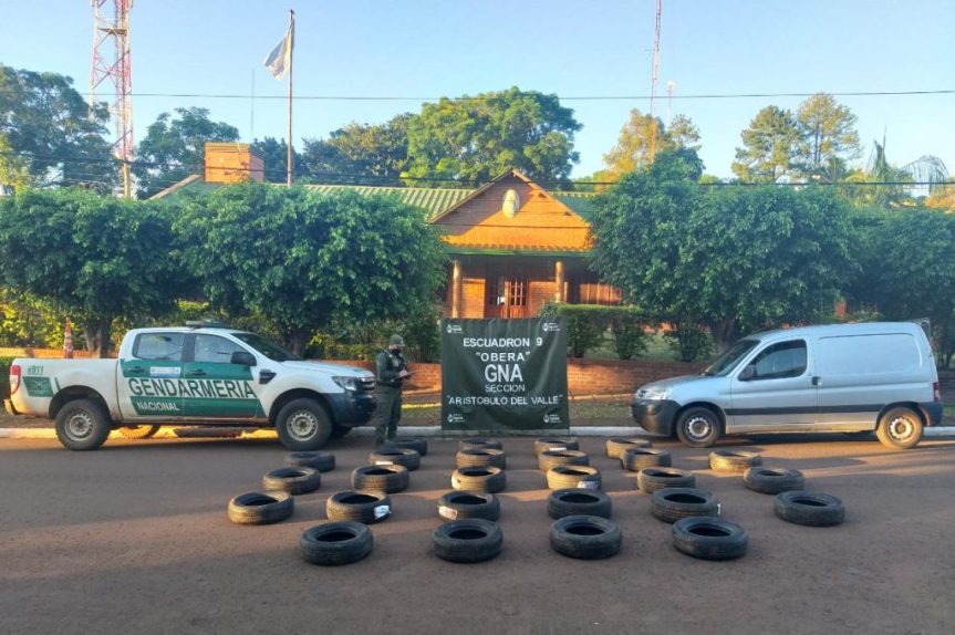 Por otra parte, el 11 de enero del presente, integrantes de la Sección Aristóbulo del Valle, dependiente del Escuadrón 9 “OBERA” logró la incautación de Cubiertas de origen china, sin el correspondiente aval aduanero que justifique su legal tenencia.