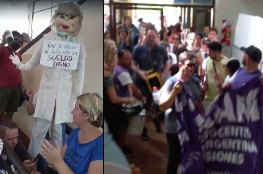 Tras pasar la noche en el Consejo General de Educación, los maestros misioneros mantienen tomado el edificio del Consejo General de Educación reclamando ser atendidos por el gobierno provincial. Reclaman elevar el básico salarial de los 21.500 pesos firmados por el gremio oficialista de UDPM, a 31.800 pesos. La protesta se enmarca en la tercera semana de paro docente.