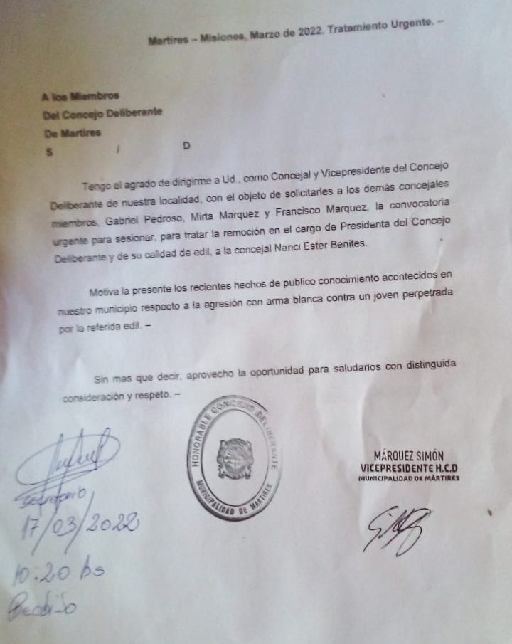 Además, Simón Marquez hizo una exposición en la comisaría local ayer 16 de marzo, para dejar constancia que convocó de manera urgente a los ediles para una sesión extraordinaria a fin de tratar la remoción de Benitez, entregando copia a Gabriel Pedrozo que se ocuparía de comunicar al resto de los concejales, pero éste no le respondió más el teléfono.