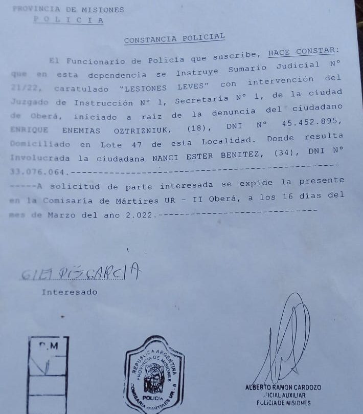 Según la constancia policial, se instruyó el sumario 21/22 caratulado «lesiones leves» con intervención del juzgado de Instrucción 1 de Oberá.