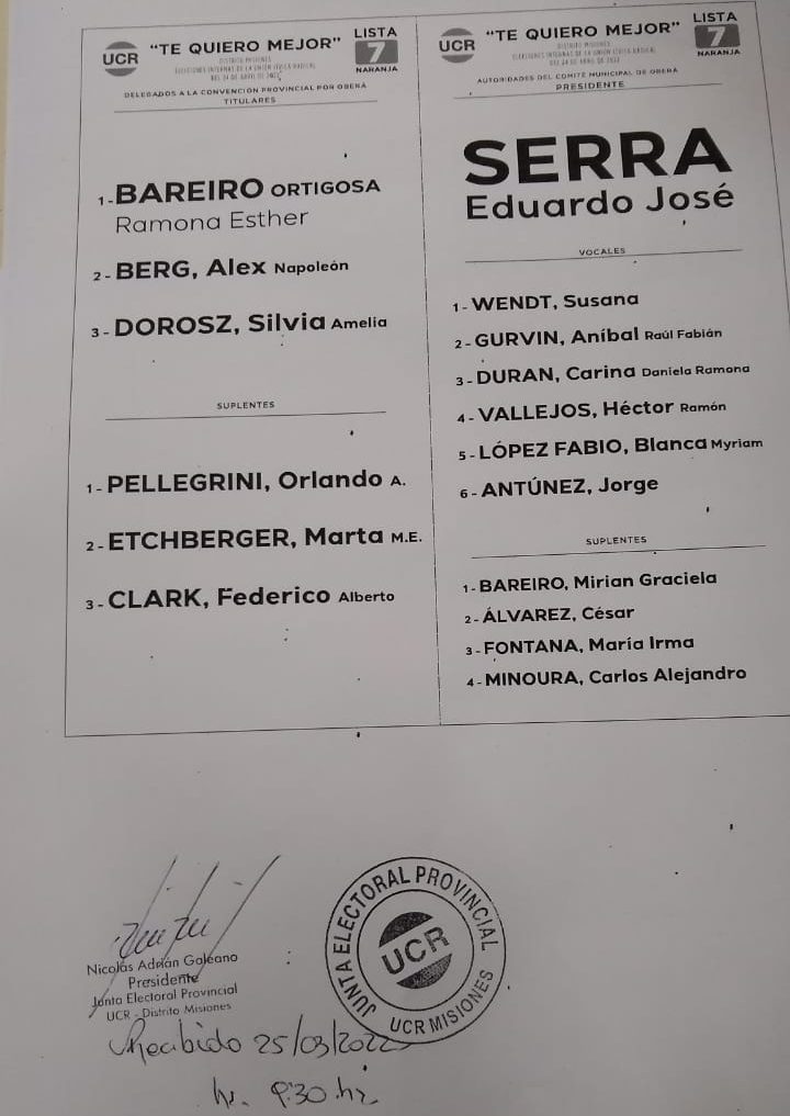 El 24 de Abril próximo, los radicales tendrán elecciones internas en la provincia de Misiones, y también en Oberá. Al respecto, se presentó la lista TE QUIERO MEJOR – Nº7 – color NARANJA, liderada por el ex concejal y comerciante, Eduardo Serra, candidato a presidente del Comité Radical.