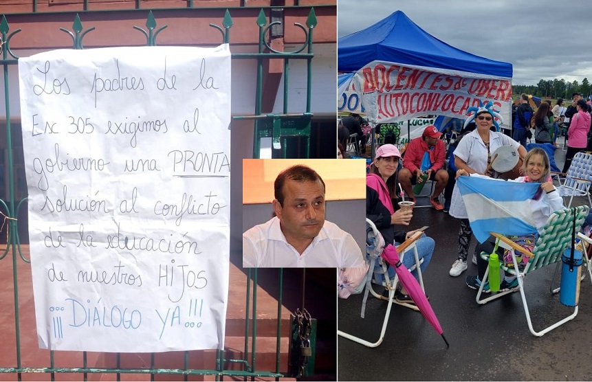 Padres de alumnos de la escuela 305 «exigen al gobierno provincial una pronta solución al conflicto sobre la educación de nuestros hijos». Así rezan los carteles colocados frente a la institución tras cumplirse un mes de huelga de maestros agremiados en el Frente de Trabajadores de la Educación en Lucha.