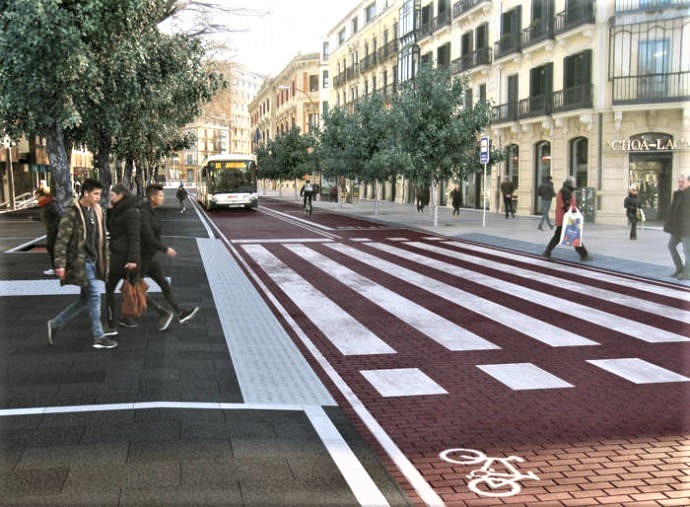 Ejemplo de una senda con leve desnivel a la calle para facilitar accesibilidad de peatones sin entorpecer el tránsito.