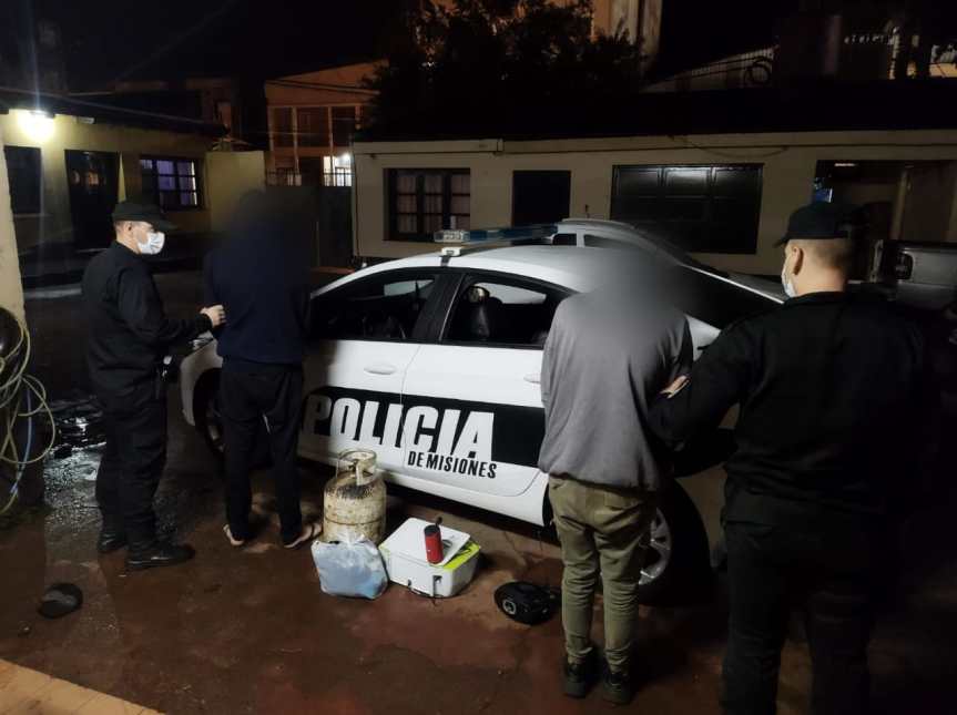 En un trabajo efectuado en la madrugada de ayer por los integrantes de la Seccional 1ra. fueron detenidos dos jóvenes, ambos de 19 años y recuperaron varios elementos como ser, un parlante y una radio portátiles; una impresora, prendas de vestir varias, además de una garrafa de 10 kg.