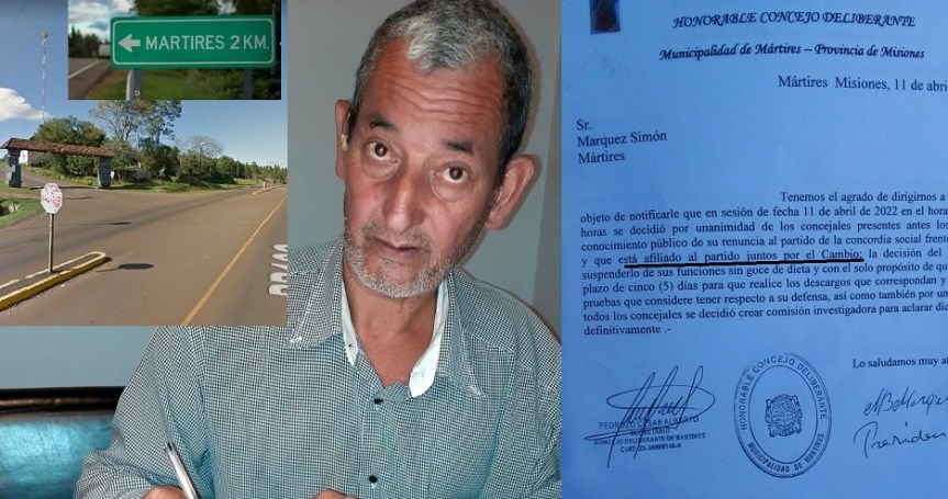 Concejales renovadores del municipio de Mártires suspendieron al edil Simón Marquez, acusándolo de pasarse de partido político. En la notificación enviada a Márquez el 11 de abril, le explican que por unanimodad decidieron suspenderlo sin goce a habéres por renunciar al Frente Renovador de la Concordia para afiliarse al frente Juntos por el Cambio, razón por la que además abrieron una comisión investigadora.