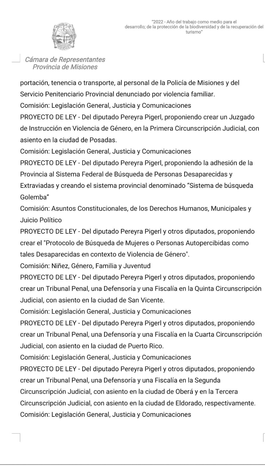 Entre ellos se encuentran, la creación del Juzgado de Instrucción N 3 de Oberá, que ya tiene dictamen de comisión. Además propone establecer en el ámbito del Ministerio de Gobierno, el Registro de Cámaras de Vigilancia Privadas, como así también incorporar al Código Procesal Penal, la figura del testigo de indetidad reservada, como el Programa de Protección a Víctimas, testigos y otros sujetos procesales, crear un fondo provincial permanente de recompensas y el programa provincial de coordinación para la búsqueda de personas ordenada por la justicia, denominado «Buscar Misionero».