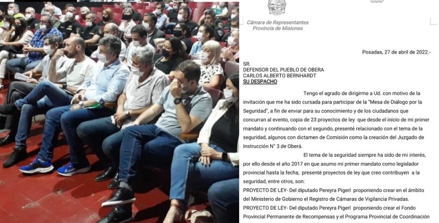 En el marco de la Mesa de Diálogo por Seguridad llevada a cabo ayer en el Cine Teatro Oberá, el diputado provincial, Rafael Pereyra Pigerl envío una nota al Defensor del Pueblo, Carlos Bernhard en la que expone los 23 proyectos de ley presentados -de su autoría- respecto al tema seguridad.