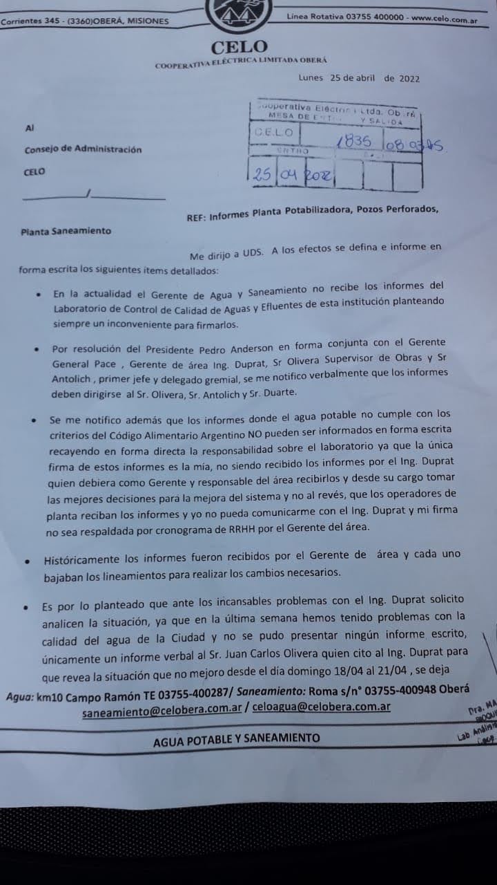 La bioquímica que analiza el agua potable de la cooperativa, Mariel Koch, envió una nota al Consejo de Admnistración de la CELO asegurando que «el gerente del sector de Agua Potable (Julián Duprat), no recibe los informes del laboratorio de control de calidad de aguas y efluentes de esta institución planteando siempre un inconveniente para firmarlos», aseguró Koch.