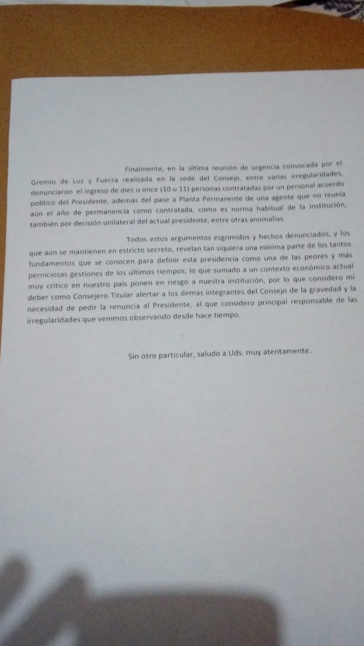 Además, menciona que «en la última reunión de urgencia convocada por el gremio Luz y fuerza realizada en la sede del Consejo entre varias irregularidades, denunciaron el ingreso de 10 u 11 personas contratadas por un personal acuerdo político del presidente», como así también «el pase a planta permanente de una agente que no reunía aún el año de permanencia como contratada».