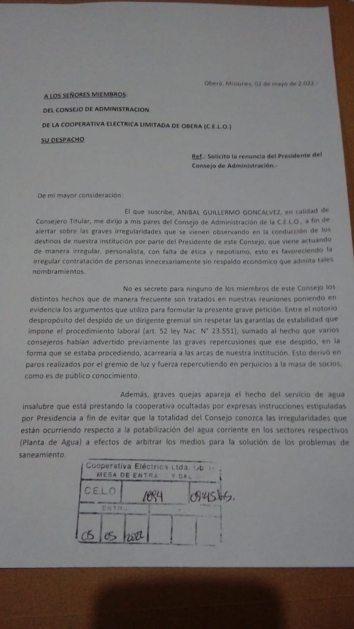 Se trata de Anibal Guillermo Goncalvez quien presentó el 2 de mayo una nota dirigida a sus pares donde manifesta alerta sobre las graves irregularidades irregularidades que se vienen observando en la conducción de la cooperativa por parte del presidente Pedro Andersson, mencionando falta de ética, nepotismo, personalismo y contratación de personas innecesarias para la institución.