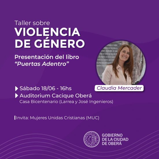 Claudia Mercader presentará el libro “Puertas Adentro” y brindará un taller de Violencia de Género el día sábado 18 de junio a las 16hs en el Auditórium Cacique Oberá, de la Casa del Bicentenario ubicado en calle Larrea y José Ingenieros.