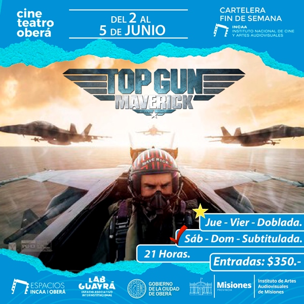 Cuatro películas para disfrutar este fin de semana en el espacio INCAA obereño: las taquilleras Jurassic World en 3D y Top Gun Maverick, además de las argentinas Sector Vip y La Dosis.