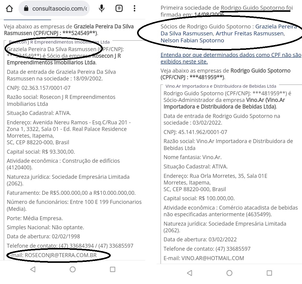 Pero además, Rodrigo Guido Spotorno también posee otra empresa en Itapema. Se trata de N. R. Investimentos Ltda., cuyo rubro es inmobiliario y el correo de contacto declaron antes las autoridades de ese país es MARIANA@ROSECON.COM.BR, es decir, con vínculo a la empresa propietaria del avión donde se pretendían fugar 491 mil dólares a Brasil. Además la dirección declarada de N.R Investimentos Ltda. es Av Nereu Ramos, 3322, la misma de Rosecon.