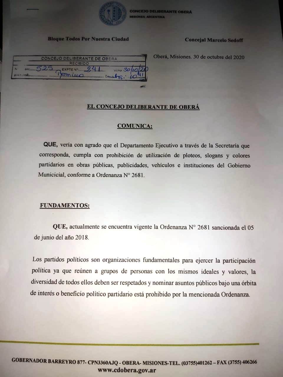 Con fecha del 30 de octubre de este año 2020, el concejal Marcelo Sedoff presentó un pedido para que se respete la prohibición de utilizar slogans y colores partidarios en bienes municipales, instituciones, vehículos, etc, ordenanza vigente desde 2018 por iniciativa de su par Horacio Loreiro, pero que la gestión de Carlos Fernández nunca cumplió, y hasta en folletos contra el dengue, aparecía el slogan «Para adelante».