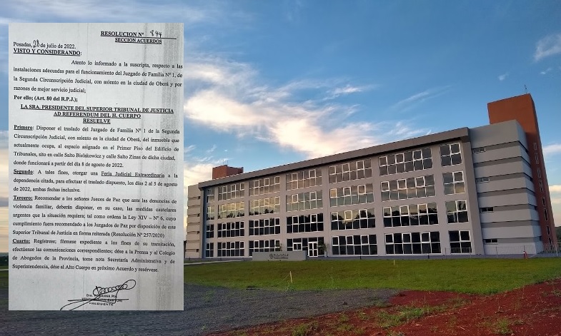 La resolución establece disponer el traslado del Juzgado de Familia Nº1 de Oberá ubicado actualmente sobre un inmueble alquila de calle Gobernador Barreyro, al espacio asignado en el primer piso del nuevo Edificio de Tribunales sobre calle Salto Bielakowicz y calle Salto Zinas, en el barrio Kleiven, a 6 cuadras de la avenida de las Américas a partir del 8 de agosto de este año.