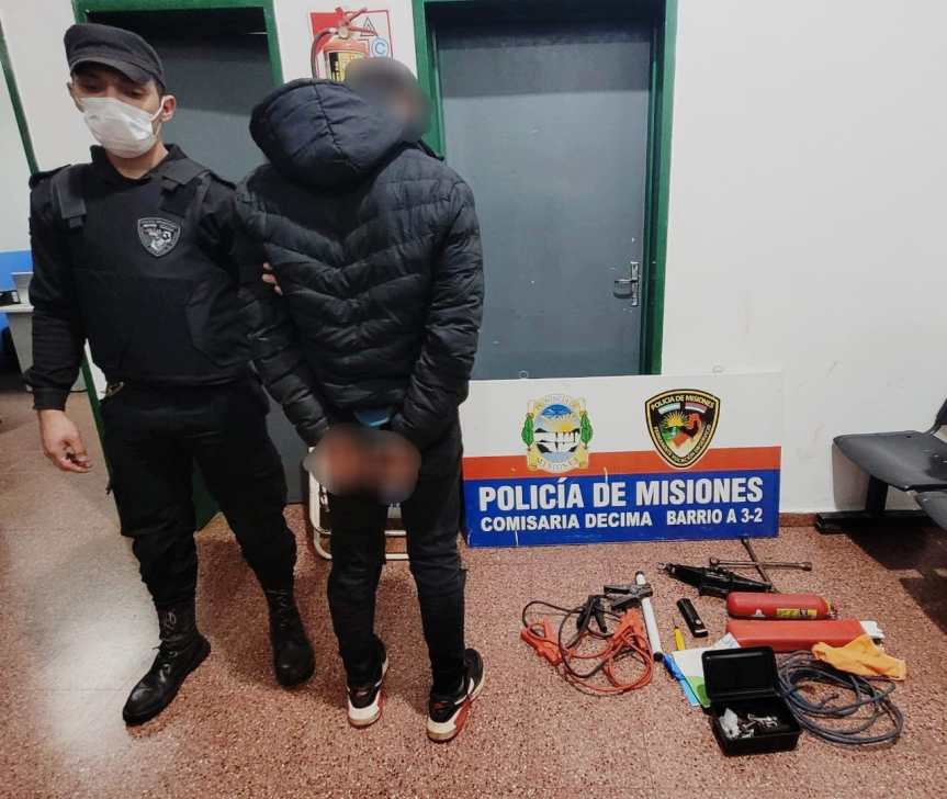 Se trata de un joven de 21 años, quien esta mañana irrumpió una vivienda del barrio Miguel Lanús de Posadas, de donde se robó varios elementos, entre ellos un kit de balizas de un automóvil, un matafuegos, un gato hidráulico, pero la Comisaría 10.ª lo detuvo cuando intentaba darse a la fuga con los objetos.