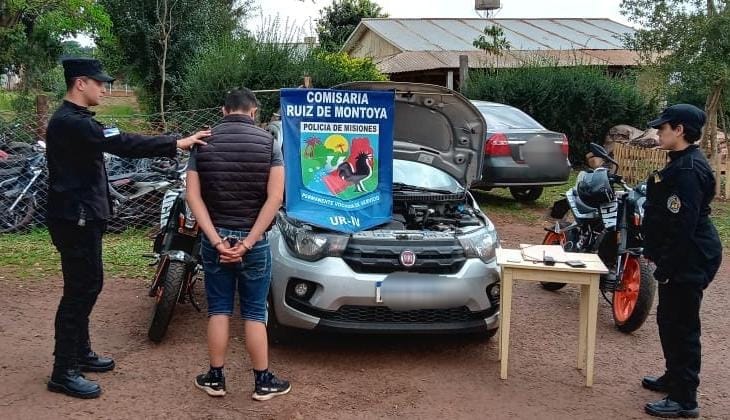 Un joven de 21 años que circulaba al mando de un Fiat Mobi, terminó detenido ayer a la mañana en Ruiz de Montoya tras una persecución policial, luego de que evadiera un control policial en ruta. Al verificar la patente, los policías comprobaron que el rodado era robado de la localidad de San Justo (Buenos Aires) no obstante, el conductor portaba un radio portátil de comunicaciones, el cual también fue secuestrado.