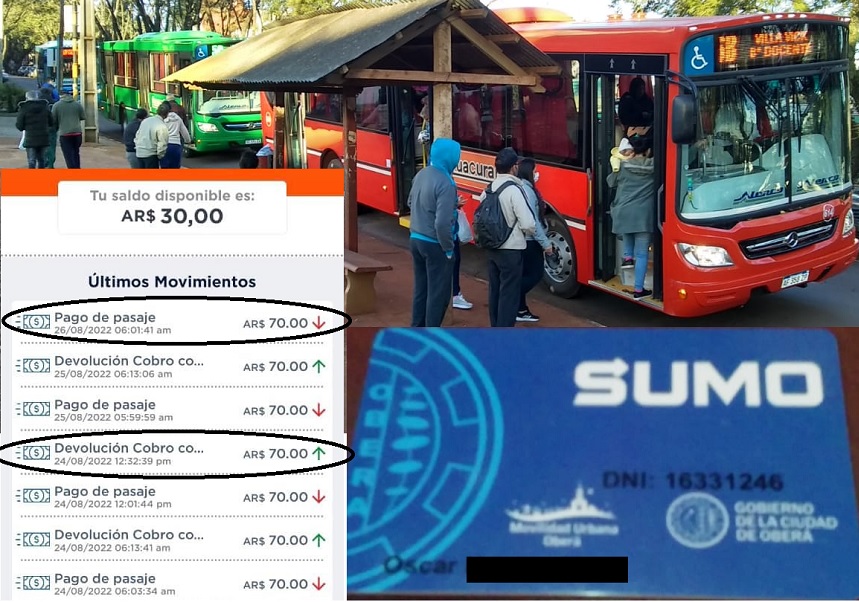 Padres de estudiantes que son usuarios del transporte público de Oberá, reclaman que el sistema, pese a estar subsidiado para ser sin cargo mediante el BEEG (Boleto Estatal Estudiantil Gratuito); les cobra 70 pesos cuando suben al colectivo, pero cuando bajan, no siempre les devuelve generando una situación de tensión con los choferes que son la cara visible, y el resto de los pasajeros.
