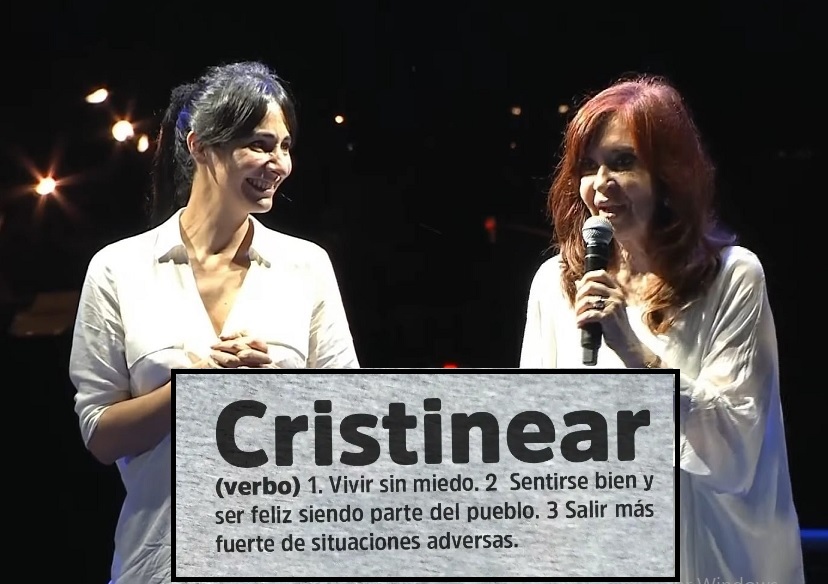 Cristinear: 1. Inventarse un pasado revolucionario inexistente. 2, Usurpar un título universitario. 3. Robarse todo lo que se tenga al alcance de la mano para vivir lujosamente mientras se posa de popular. 4. Armar operetas burdas para victimizarse y escapar de causas judiciales..
