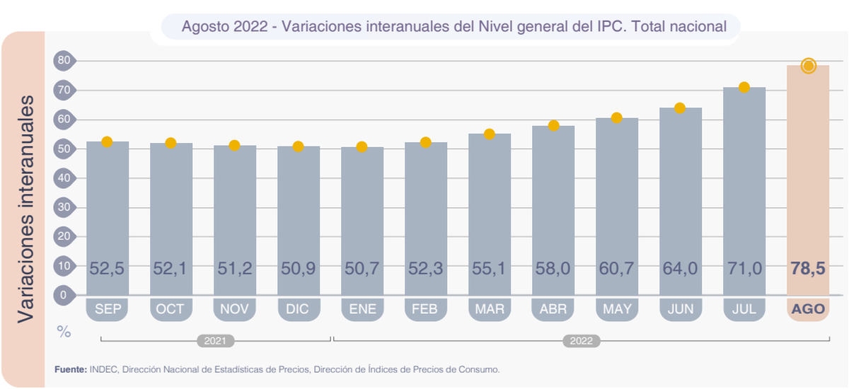 Con ese porcentaje, la inflación de los primeros ocho meses del año alcanzó a 56,4%. En tanto, la inflación interanual (de los últimos 12 meses) llega al 78,5%. Este último dato es el peor que se tiene registrado desde el año 1992, treinta años atrás, cuando en enero el acumulado anual había sido del 76%.