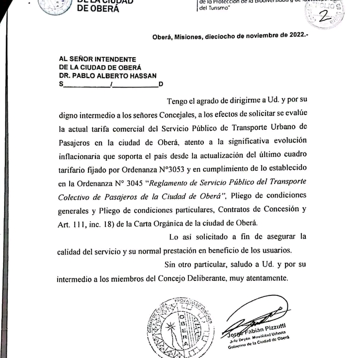 «Por este motivo yo convoco a los obereños a expresar su opinión sobre el posible AUMENTO del boleto y a referirse sobre el transporte urbano actual en distintos aspectos como»: